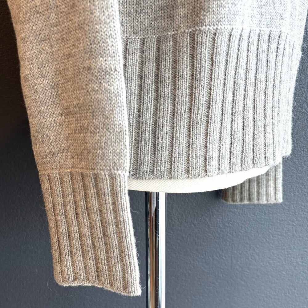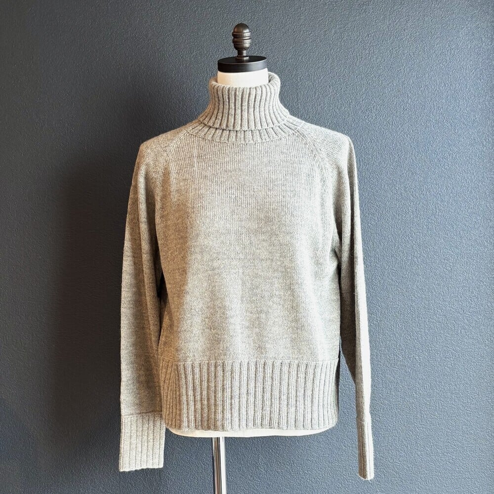 寒い日に嬉しいタートルセーター。袖口がストレートになって、太目のリブがアクセントになったデザインです。デンマークで人気の袖口で、シンプルなデザインの中に少しだけトレンドを取り入れています。着用イメージも割とすっきりとしたシルエットなので、アウターを着ても綺麗なスタイリングをキープ出来ます。アルパカ100%なので、暖かく、スタイリングしやすいDoveカラーは1枚あるととても便利です。