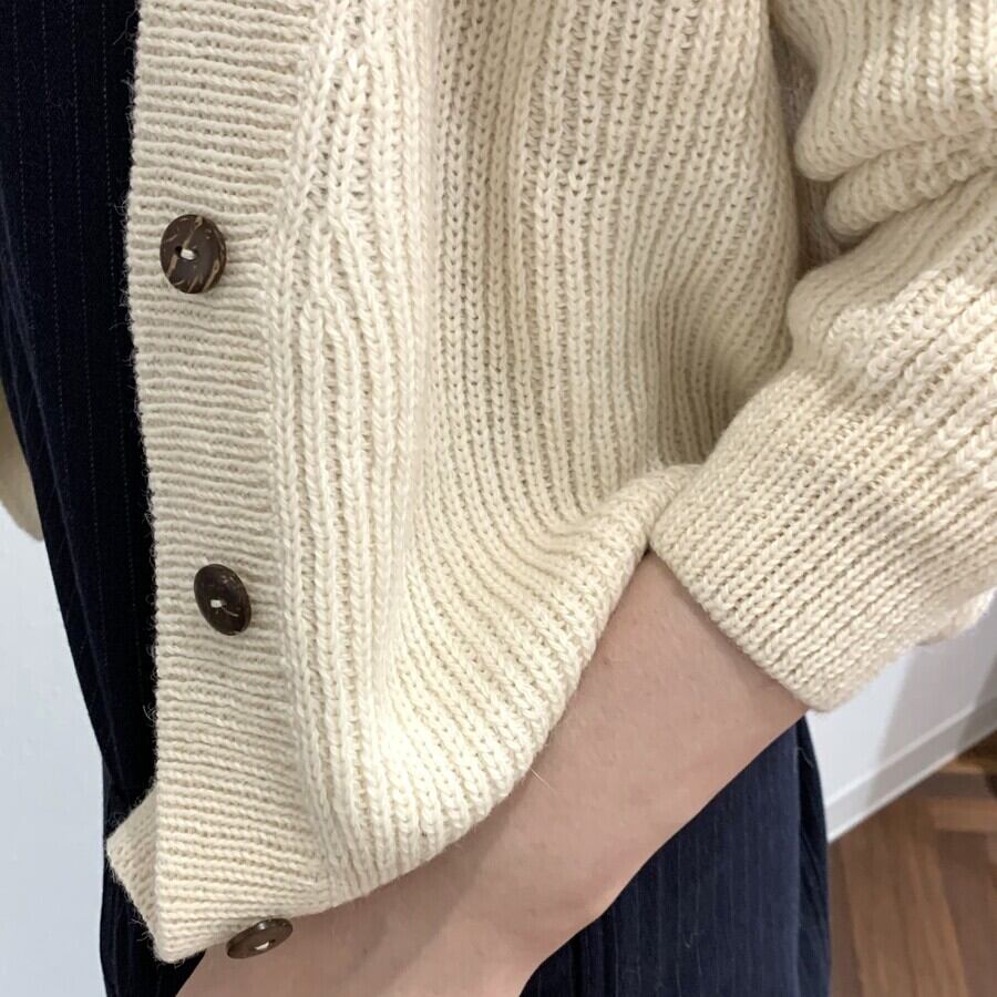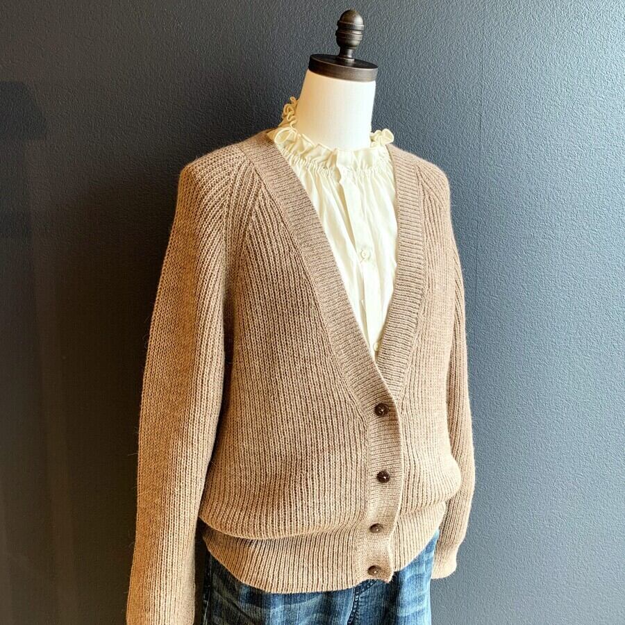 シンプルなVネックのリブ編みカーディガン。袖口と裾のリブの幅をしっかり作って、袖口と裾をふんわりとした膨らみを持たせ、上品なカーディガンに仕上げています。アルパカ100%なので、とても暖かく、肌触りも柔らかいのでストレスなく着て頂けます。Pebble(小石のような色)カラーは、落ち着きのあるベージュの上品な色使いで、大人のスタイリングにまとめてくれます。(モデルさんはIvoryカラーを着用しています。)